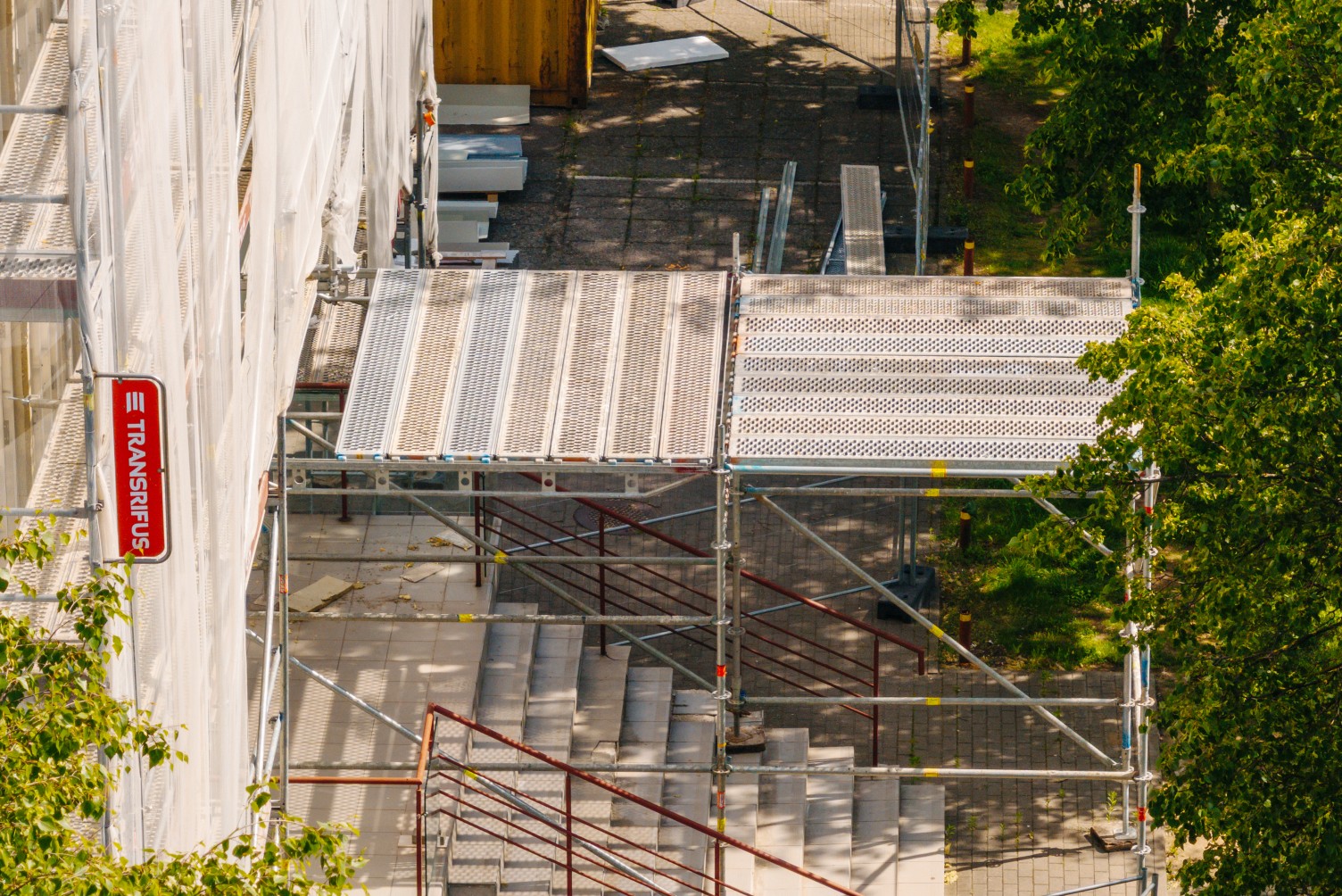 Renovuojamam objektui parengėme fasadinių pastolių projektą, kurio metu įvertinome pastato aukštį, būsimas apkrovas. Montuojant pastolius įrengėme specialius stogelius, po kuriais gyventojai ir verslo įstaigų darbuotojai bei pirkėjai galėjo saugiai patekti į pastatą.