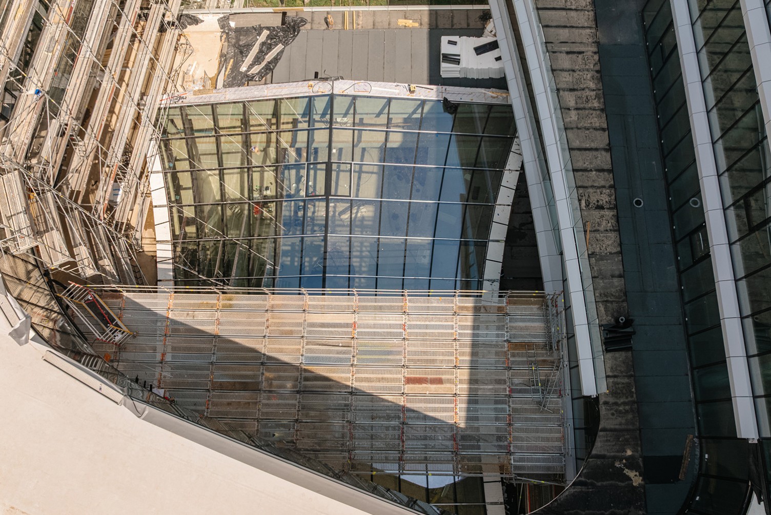 Projektas išties išskirtinis, o pastatas pasižymi sudėtingais sprendimais: jame daug lenktų sienų ir balkonų, prasilenkiančių tarpusavyje, nesutampančių vienoje ašyje. Tai reikalavo išskirtinio dėmesio atliekant įrangos planavimo ir montavimo darbus. Taip pat dalies pastolių nebuvo galima statyti ant žemės dėl stiklinio atriumo.
