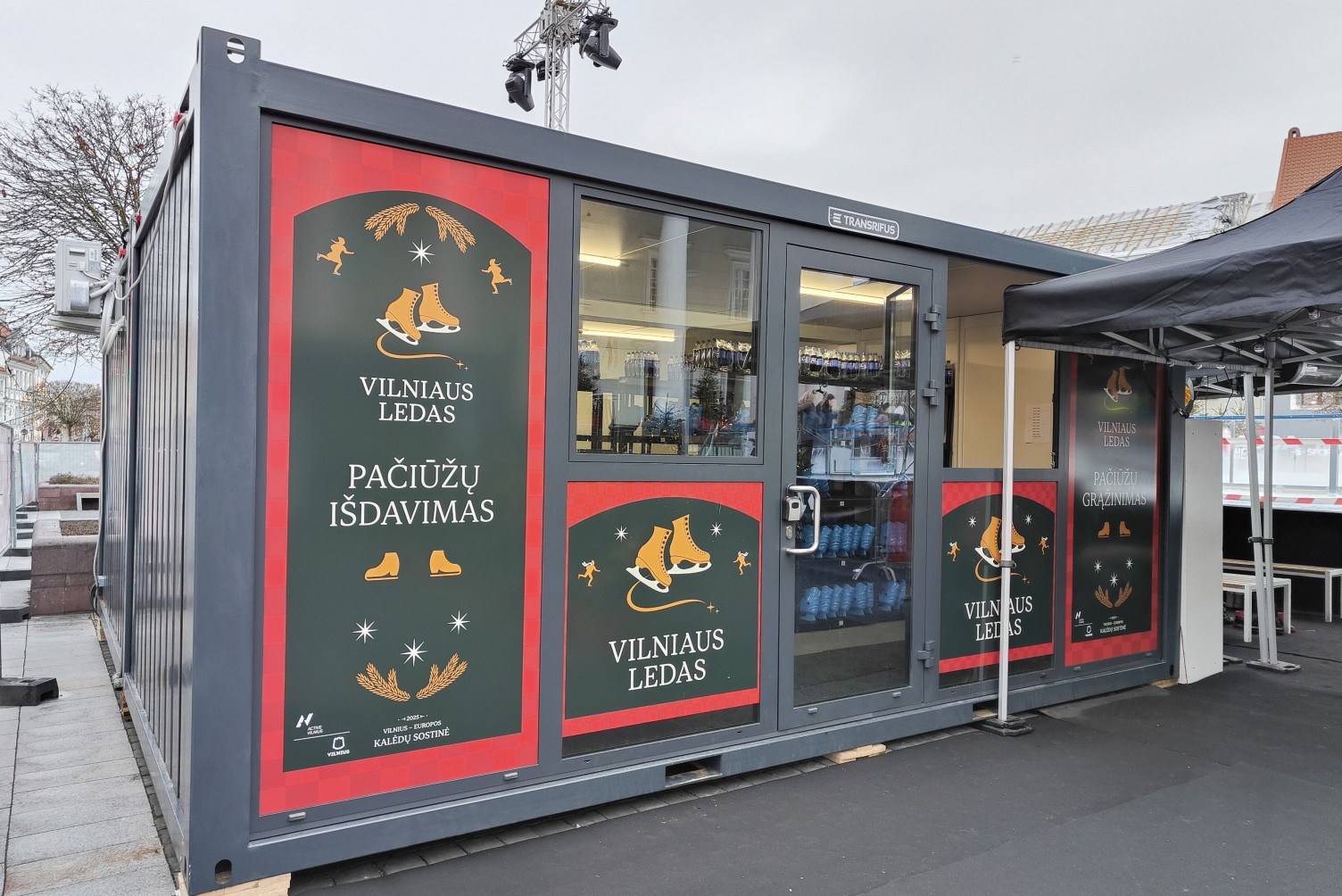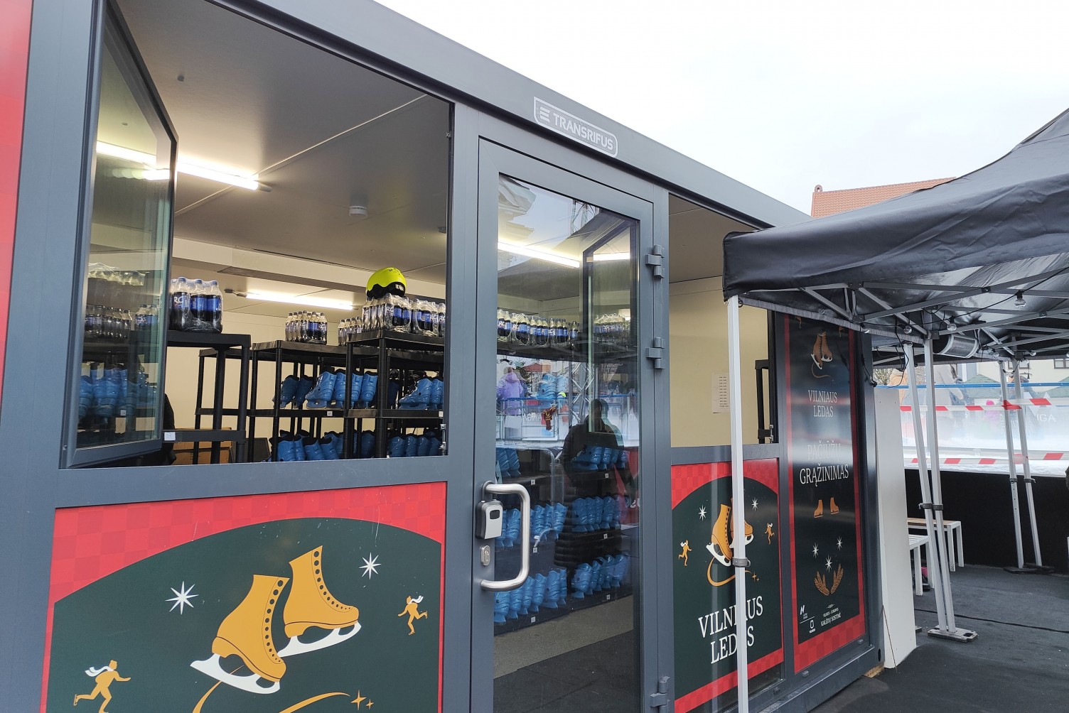 Pagal kliento išsakytus poreikius paruošėme ir išnuomavome iš dviejų konteinerių sujungtą patalpą su dviem langais priekyje. Tai suteikė galimybę aptarnauti didelį žmonių kiekį vienu metu. Klientas patogiai per vieną langą vykdė pačiūžų išdavimą, o per kitą - jų priėmimą atgal, kad žmonėms nereikėtų eiti į vidų. Dar viena atskira konteinerinė patalpa buvo paruošta bilietų pardavimo punktui.