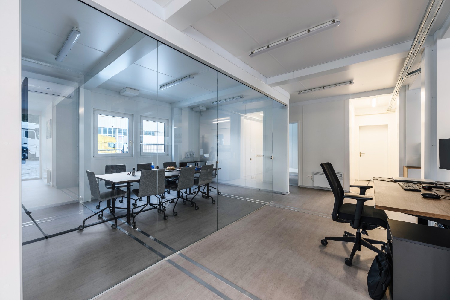 - Estetika ir modernumas. Antracito spalva, LED apšvietimas, stiklinės pertvaros ir estetiškai paslėpti kabeliai sukuria modernų ir profesionalų biuro vaizdą.