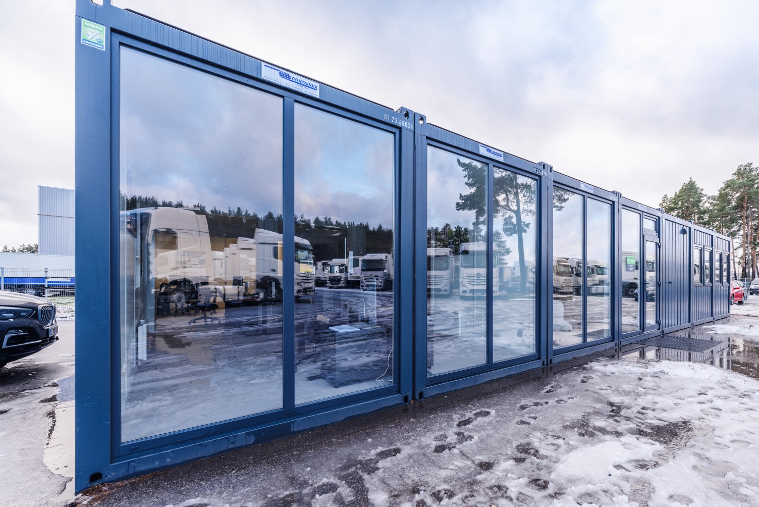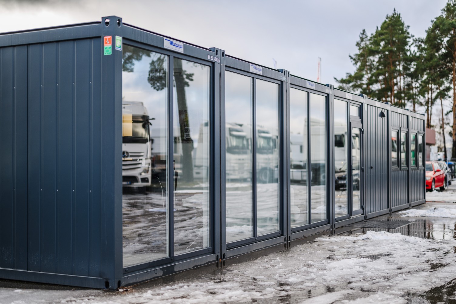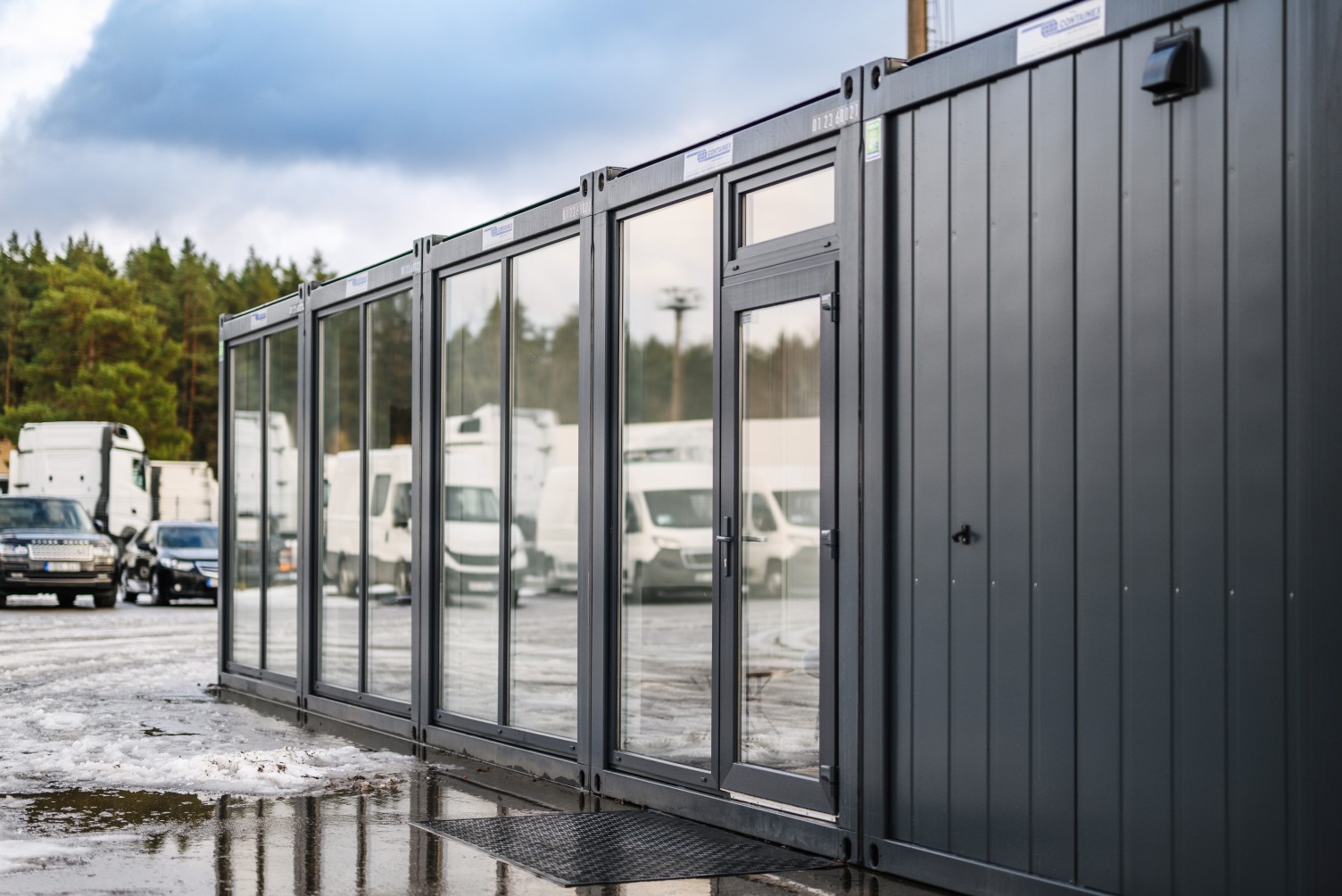 Modulinės patalpos biuro darbuotojams autotransporto prekybos aikštelėje.