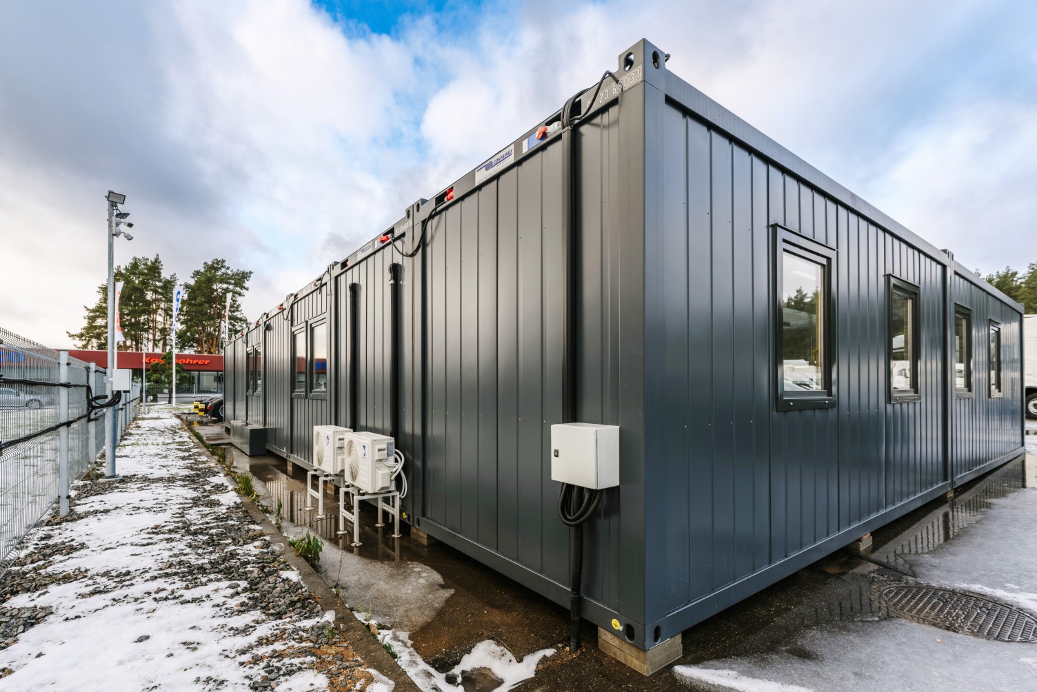 Per dviejų mėnesinį laikotarpį mūsų komanda pristatė klientui konteinerines patalpas, kurios jau buvo įrengtos su pilna vidaus apdaila – grindimis, lubomis, sienomis ir sanitariniais mazgais. Patalpose sumontuotos stiklinės pertvaros, oro kondicionavimo sistema, įrengti modernūs PVC langai, su estetiškai paslėpta kompiuterinių tinklų ir televizoriaus laidų sistema, suteikiančia patalpoms modernumo.