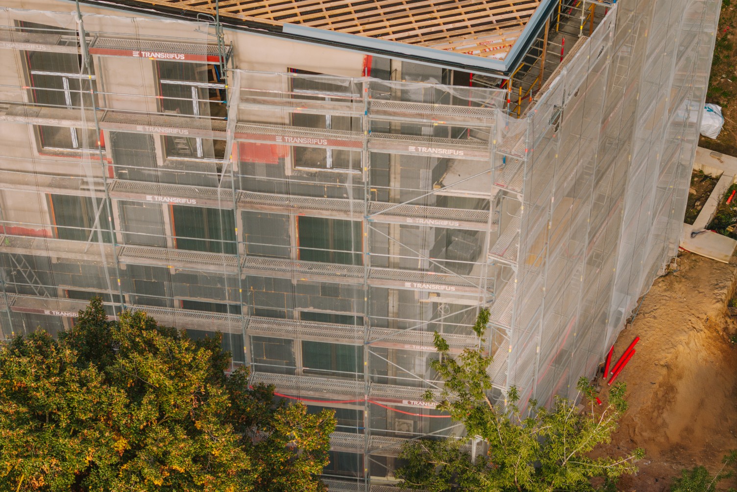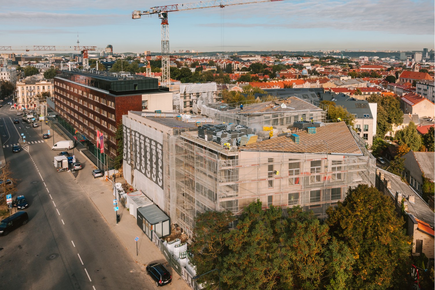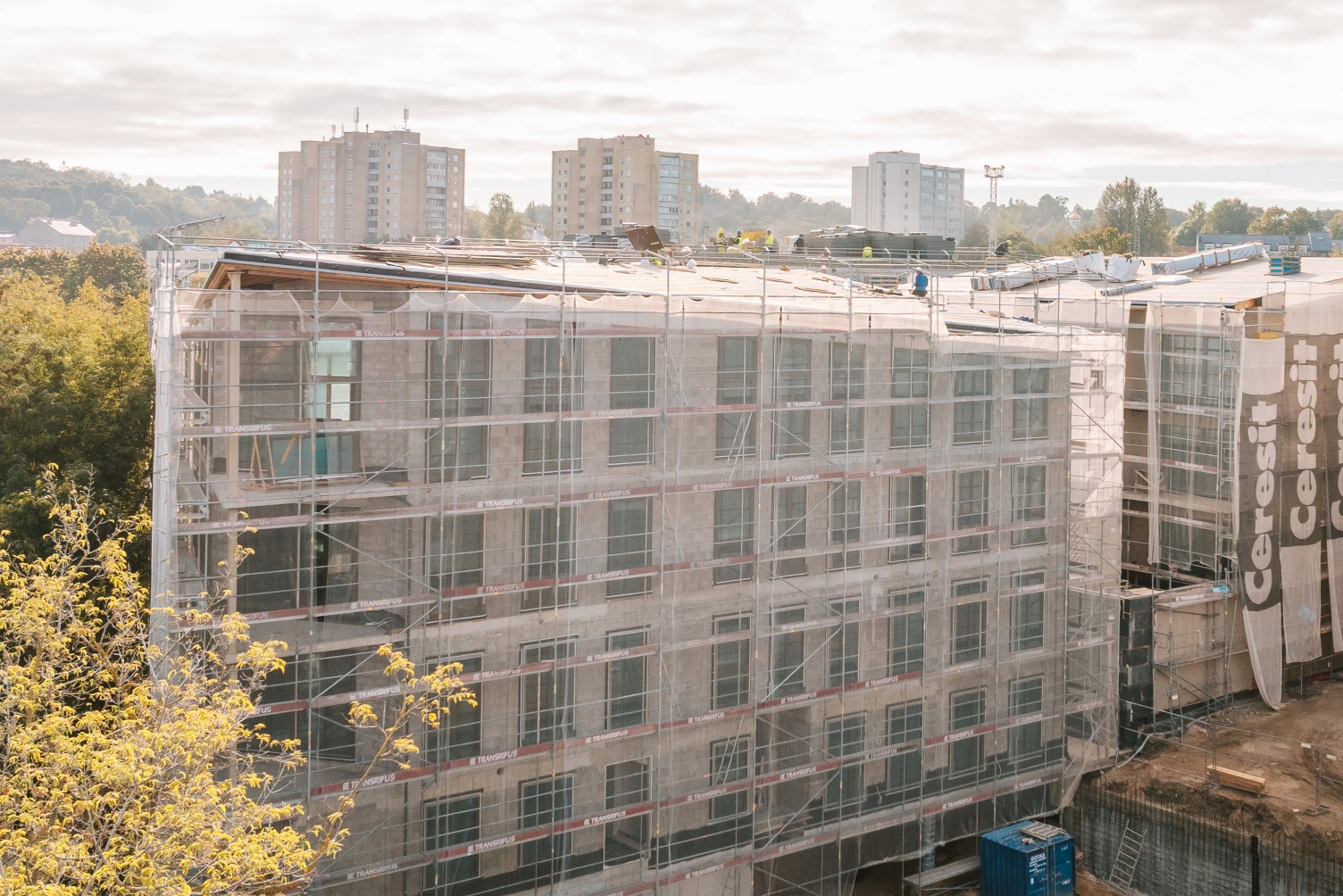 Suprojektavome ir išnuomavome pastolius paeiliui vykstančiai atskirų kvartalo korpusų statybai, tiksliai derinantis medžiagų pristatymą, įsivertinant situaciją aikštelėje konkrečiu momentu ir atliekant pokyčius pagal kliento grafiką. Tose vietoje, kur pastolių nebuvo galima montuoti nuo žemės, juos tvirtinimoe kabindami ant sijų.