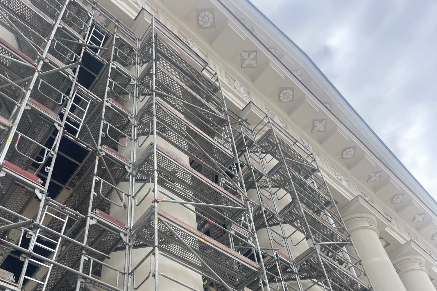 - Patogumas darbininkams. Tinkamas pastolių suprojektavimas ir sumontavimas lemia patogų remonto darbų atlikimą. Klientas galėjo visu perimetru pasiekti varpinės fasadą ir kolonas.