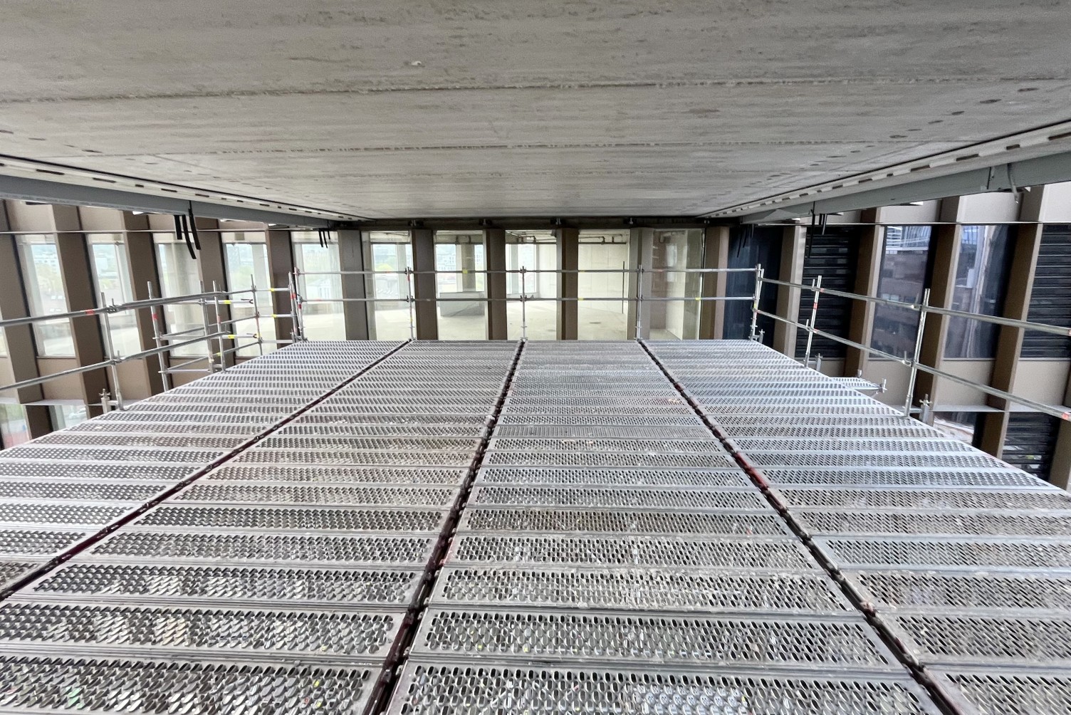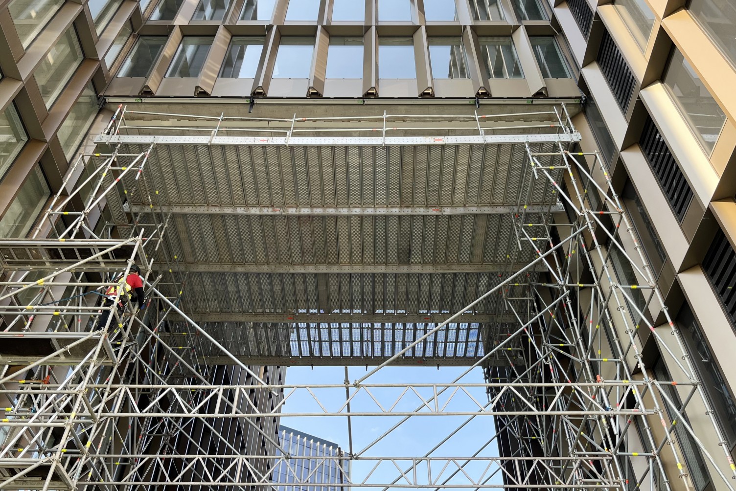 Įvertinus iššūkius, kad darbai vyks ant stogo, kuriame įrengti langai, ir 14 m konstrukcija turi stovėti visiškai neankeruota į pastatą, klientui pasiūlytas unikalus sprendimas. Sprendimui įgyvendinti naudojome aliumines FlexBeam sijas, modulinių pastolių ir santvarų sistemą. Šių sistemų junginys leido įrengti laisvai stovinčią pastolių konstrukciją.