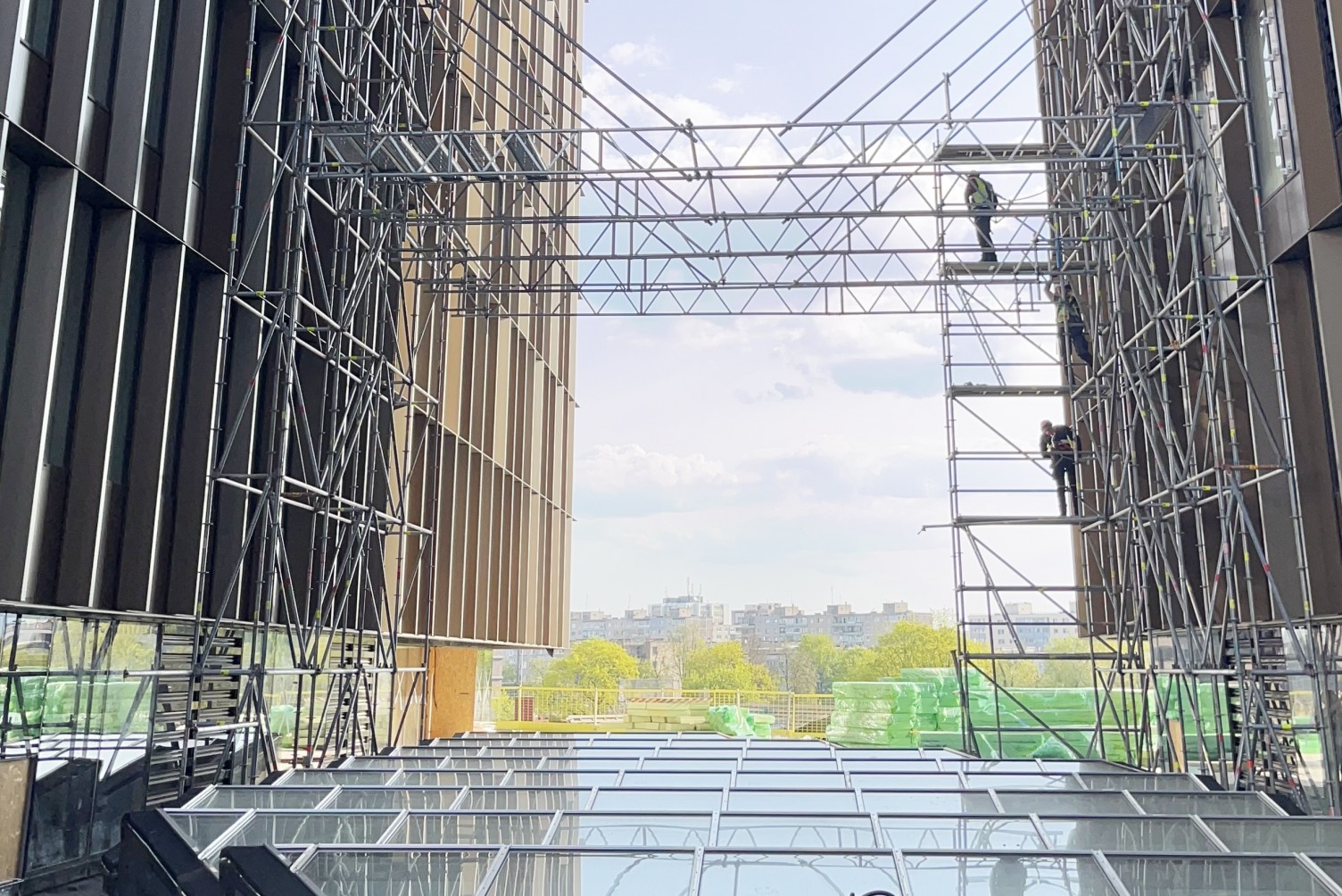 Virš naujai statomo pastato stogo yra įrengtas tunelis, kuris jungia du pastato korpusus. Tunelio (balkono) apdailai montuoti buvo reikalinga platforma. Tačiau po tuneliu esančiame stoge yra atriumas, kuriame sumontuoti langai. Dėl jų šioje situacijoje nebuvo galima naudoti važinėjančios technikos - reikėjo įrengti stacionarią platformą.