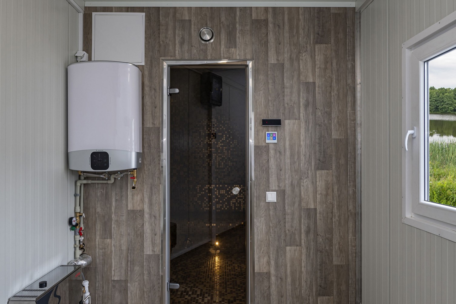 Įrengta pertvara, skirianti priešpirtį nuo pirties patalpos. Įmontuotos stiklinės įėjimo durys.