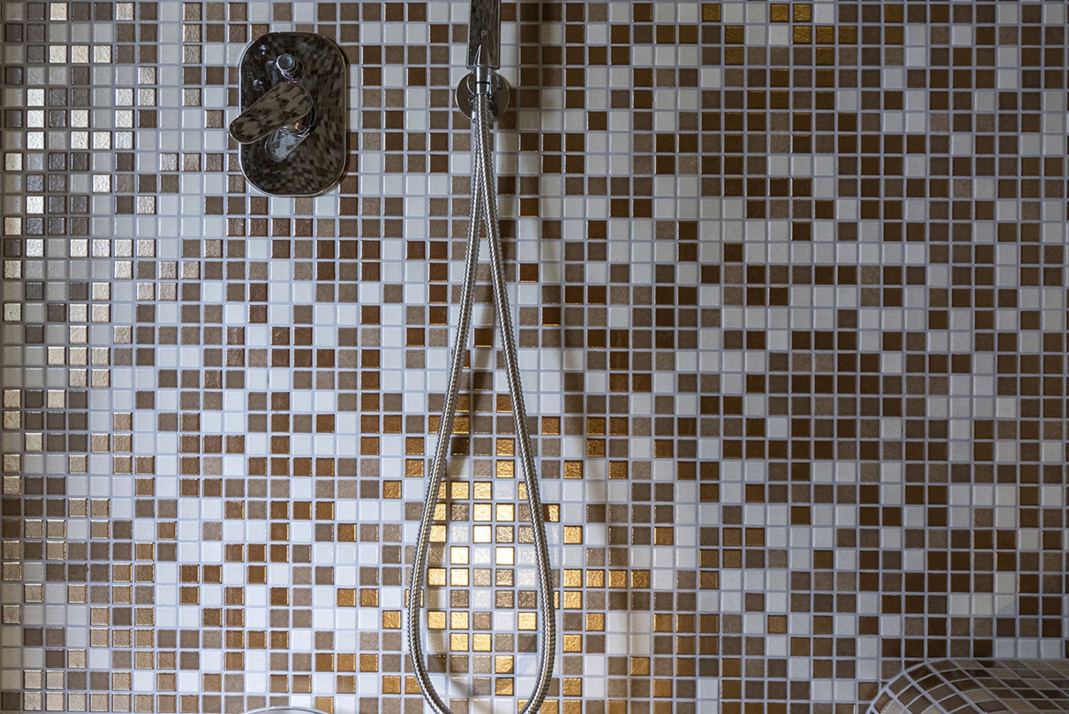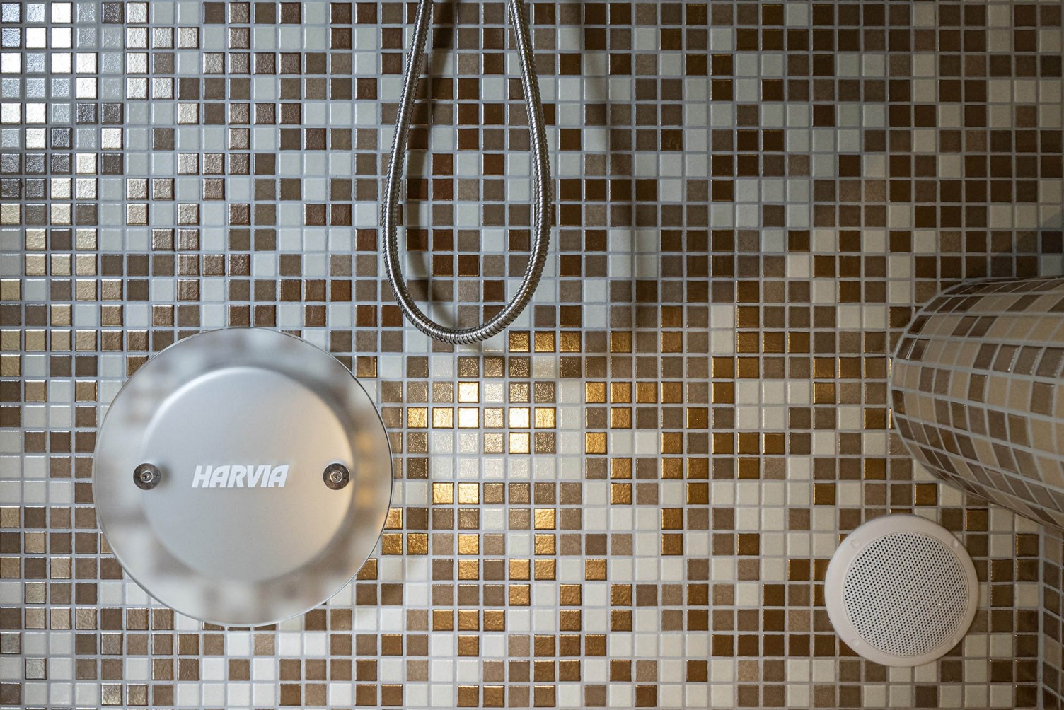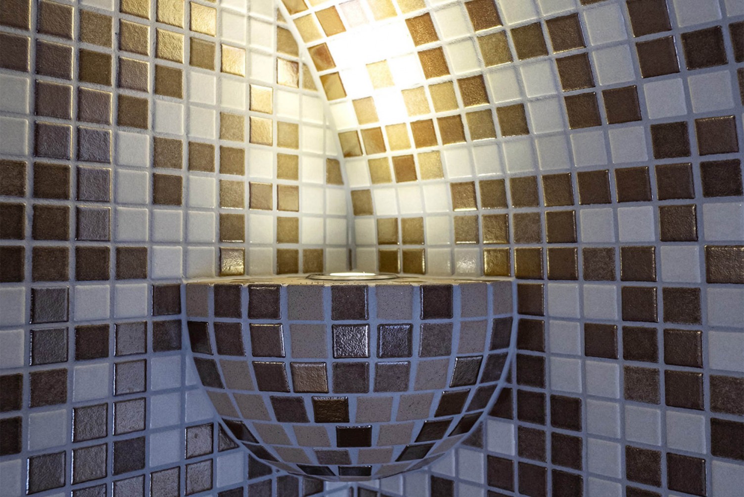 Įrengta pirties patalpa su skliautais. Paviršius išklijuotas mozaikinėmis plytelėmis.