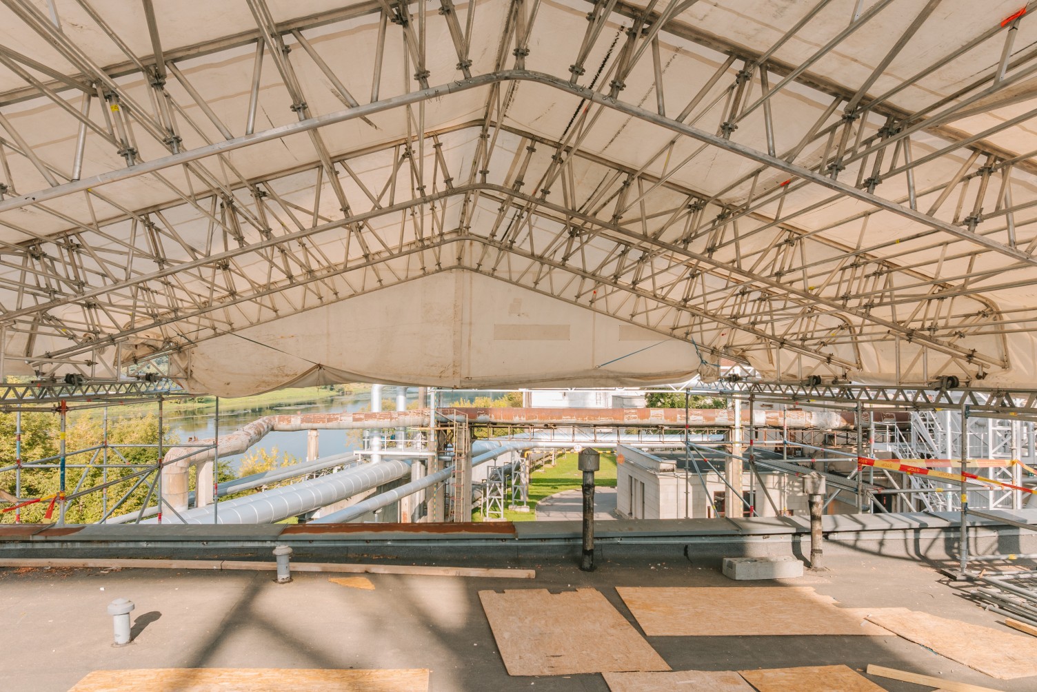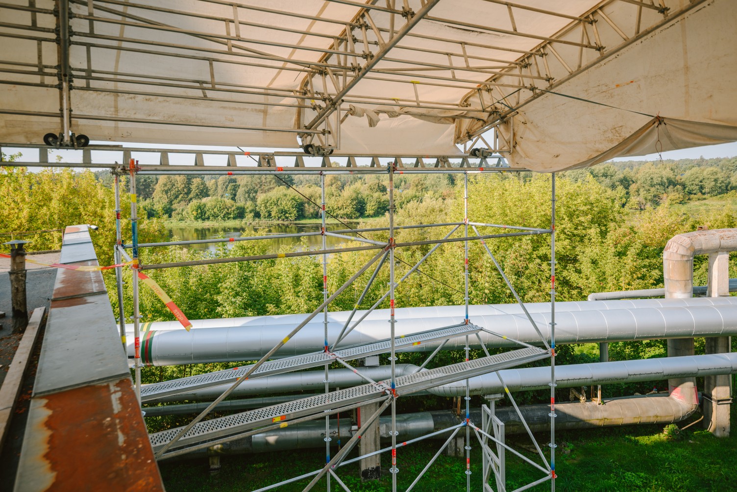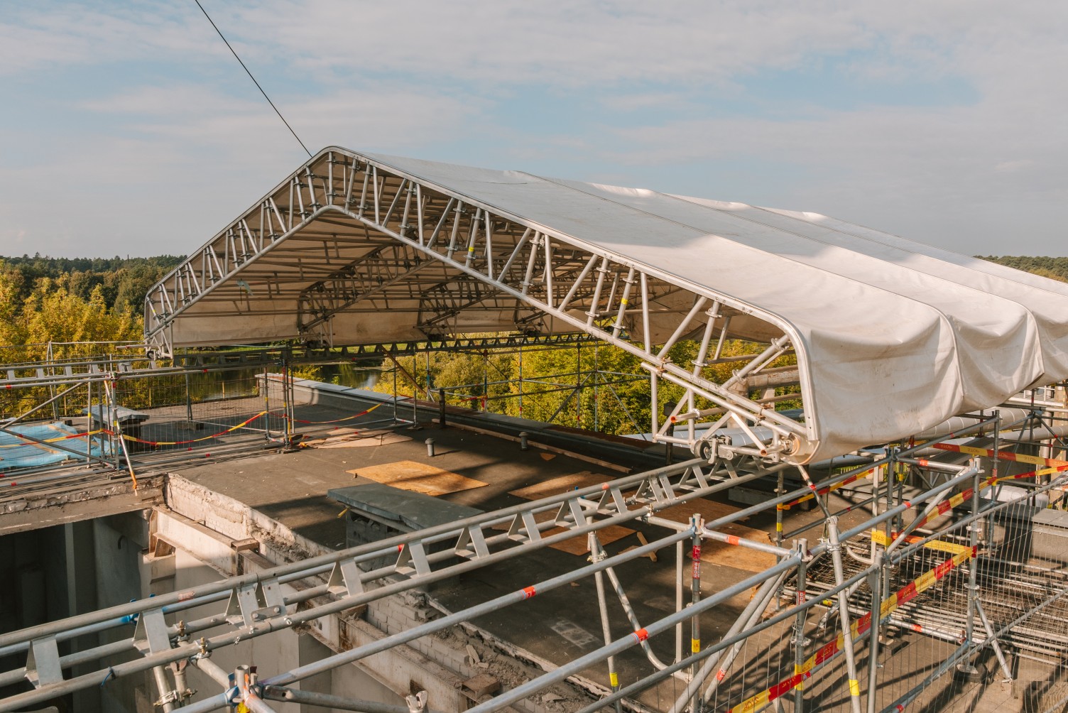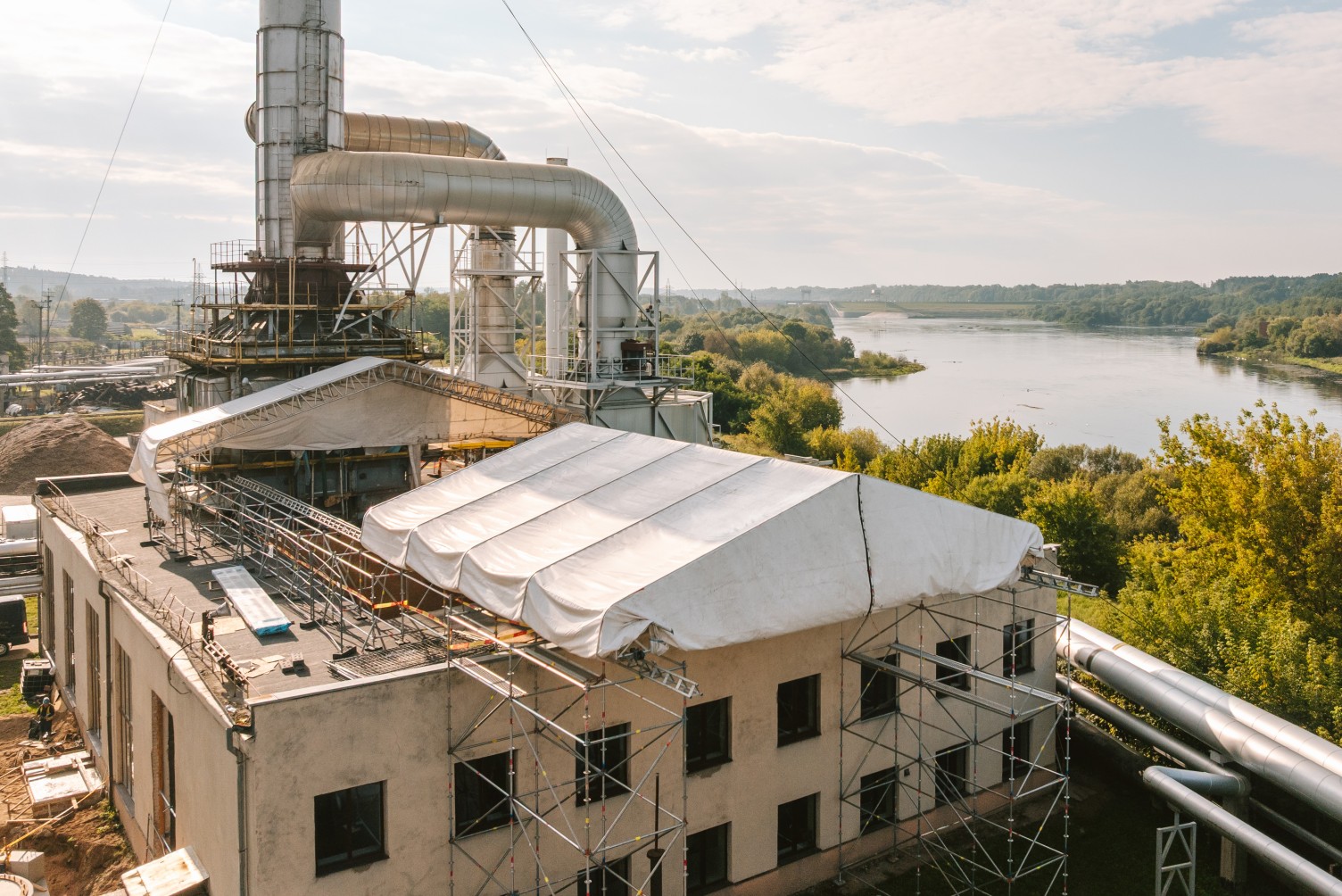 Atliekant remonto darbus elektrinėje, klientas išsakė poreikį panaudoti laikiną stogą. Darbų metu pastato stoge buvo išpjauta atvira kiaurymė, tad reikėjo apsaugoti viduje esančius įrengimus bei dirbančius žmones nuo orų permainų. Tačiau stabilus uždengimas šiuo atveju netiko, nes per stogą reikėjo nuolat įkelti statybines medžiagas ir kitą įrangą. Tarp ribojimų prisidėjo ir nepakankamas pastato stogo plotas, kad būtų galima patogiai ir saugiai statyti laikinus įrengimus.